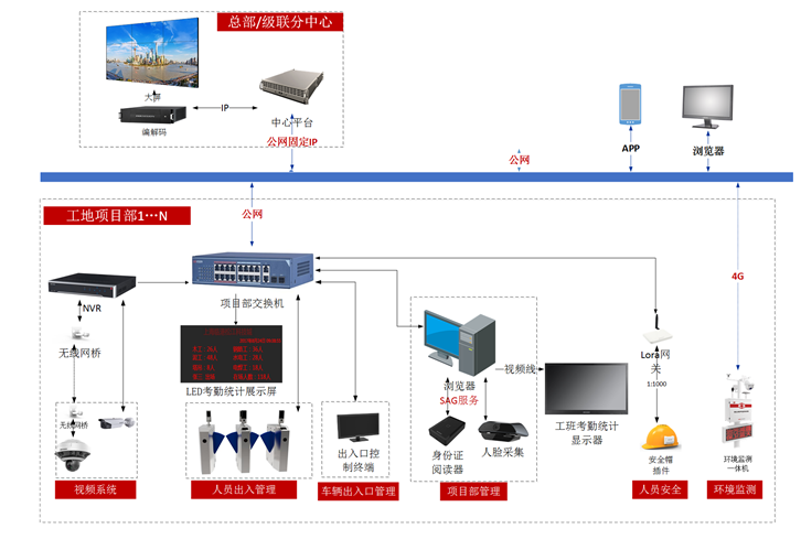 每个业务对应一个或者多个硬件系统。中心管理为监控中心。视频联网包含视频联网监控、分布式存储、视频告警联动。人员管理分为实名制考勤子系统和人员安全子系统(安全帽脱戴、定位)。起重机械管理分为塔吊安全监控子系统和升降机管理子系统。车辆管理管理为车辆出入口管理和环境管理是环境监测子系统。