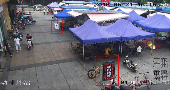 主要识别违规放置于道路或店家门口的以灯箱、电子显示装置、展示牌为载体形式的户外广告设施。
